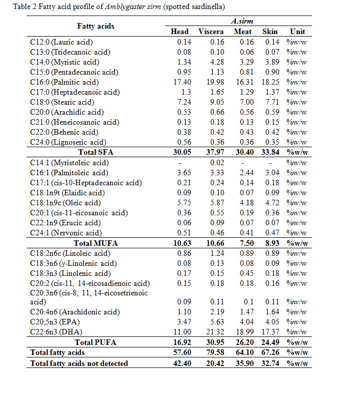 Table 2 Fatty acid profile of Amblygaster sirm (spotted sardinella) Table2: Fatty acid profile of Amblygaster sirm (spotted sardinella)