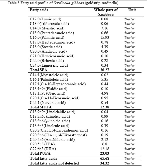 Table 3 Fatty acid profile of Sardinella gibbosa (goldstrip sardinella) Table3: Fatty acid profile of Sardinella gibbosa (gold strip sardinella)