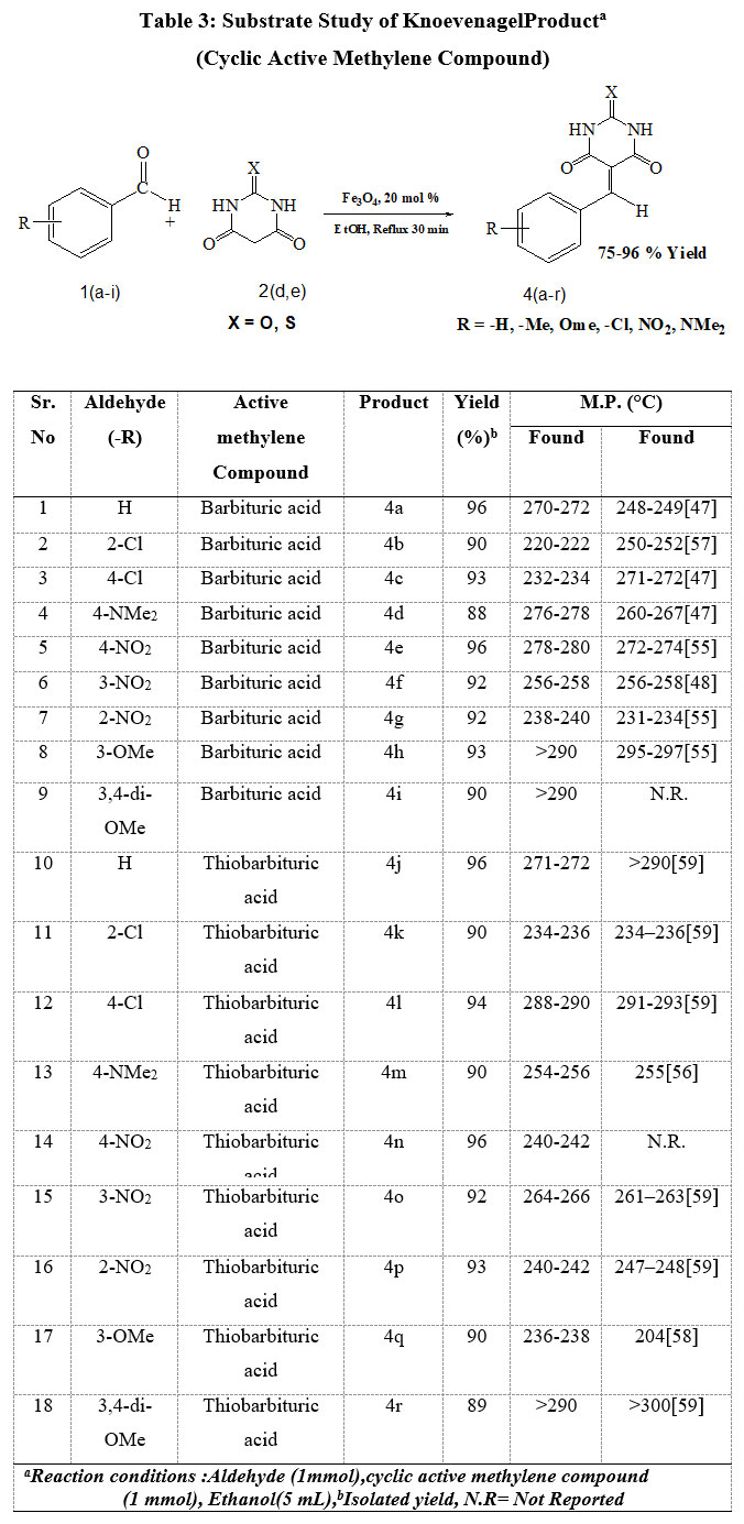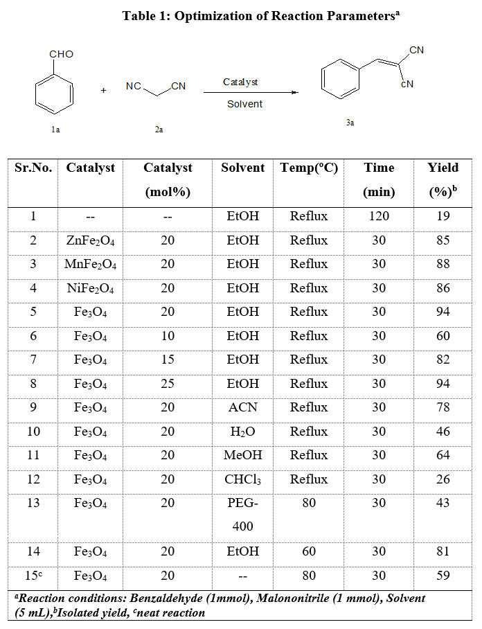We have made efforts to improve a catalytic system that would overcome the limitations of the earlier reported Knoevenagel reactions. When initial study held, benzaldehyde (1a) and malononitrile (2a) used as a represented system. optimization was done by Sequences of the experiments performed with a variety of reaction parameters, like type of catalyst, catalyst quantity, solvent, temperature and time (Table-1). Initially we have synthesized the paramount magnetically distinguishable catalysts, all MFe2O4 (M=Fe2+, Zn2+, Mn2+ and Ni2+) by screened for sample reaction. Apart from catalysts examined, Fe3O4 found to be the best, providing very good yields of the targeted product 3a (Table-1, entries 1-5). Then catalysts concentration study performed having rang 10 to 20 mol% rises the yield of product 3a up to 94%, Further increase of catalyst concentration to 25 mol% did not improve the yield of 3a (Table-1, entries 5-8). As the solvent have an impact on the overall process, the effect of various solvents (Table-1, entries 5, 9-13,15) were examined; the best results was obtained with C2H5OH which afforded 3a in 94% yield (Table-1, entry 5). We have also made temperature study data 3a obtained good yield at reflux temperature for complete consumption of aldehyde (Table-1,entries 5,14). Reaction conditions optimized and we have explore the substrate scope of the ferrite catalyzed Knoevenagel condensation of substituted aldehydes with acyclic active methylene compounds (malononitrile, ethyl cyanoacetate, ethyl acetoacetate) and cyclic active methylene compounds ( barbituric acid and thiobarbituric acid) for the synthesis of styrene derivatives having different functional groups. Thus, we have observed that electron good yield of products. Satisfyingly this protocol endured a range of common functional groups such as alkyl, ether, halogen and nitro groups irrespective of the place. Results of these reactions listed in Table-2.