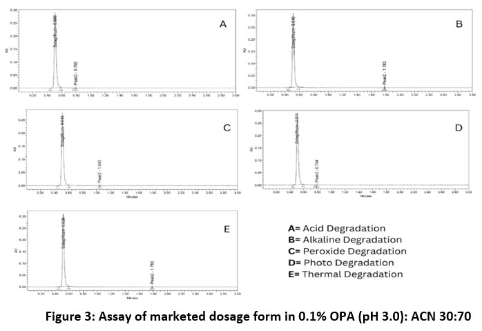 Figure 3: Assay of marketed dosage form in 0.1% OPA (pH 3.0): ACN 30:70.Click here to View Figure |