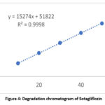 To establish linearity, a working standard solution of Sotagliflozin was made as previously described. An aliquot of the above solution has been diluted with the solvent to acquire five particular concentrations between 10 and 50 µg/ml of Sotagliflozin. A standard calibration curve was generated for the drug being studied, displaying concentration vs peak area, and the resultant data was subjected to regression analysis.