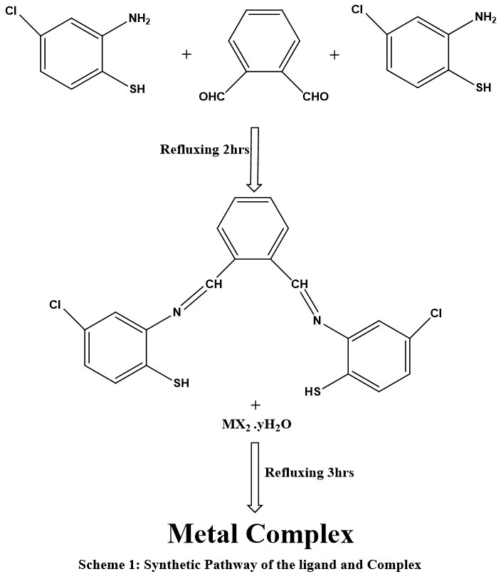 For the preparation of ligand we have adopted the method of condensation reaction. For this we have taken 10 mmol (1.34g) of phthaldehyde and dissolved it in methanol. Then drop by drop addition of amine species i.e. 2-amino-4-chlorobenzenethiol 20 mmol (3.19g) was carried out. After thar reaction mixture was refluxed for 3 hrs and light orange coloured mixture was obtained. The mixture was kept for overnight cooling at room temperature and orange colored precipitates were obtained as product. The completion of the reaction was analysed by single spot on TLC. Scheme 1.