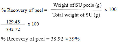 The freshly purchased pesticide free SU was rinsed thoroughly with running water and then DI water to remove all the dirt. Firstly, the peels are removed manually from the pulp and some parts like flower end pit, fins, bracts and areole were also eliminated from the peel. The percentage recovery of peel from the pulp was calculated to identify the average biowaste discarded which are generally rich in biomolecules. (equation 1).