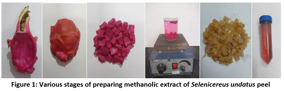 Figure 1: Various stages of preparing methanolic extract of Selenicereus undatus peel. |