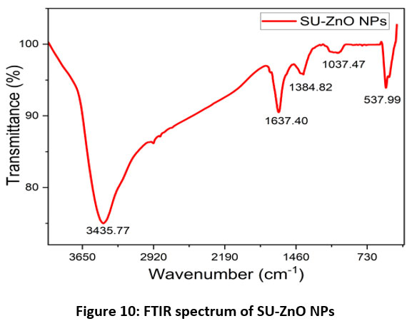 Figure 10: FTIR spectrum of SU-ZnO NPs. |