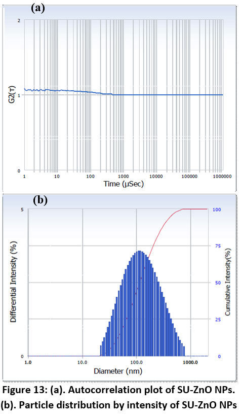 Figure 13: (a). Autocorrelation plot of SU-ZnO NPs. (b). Particle distribution by intensity of SU-ZnO NPs |