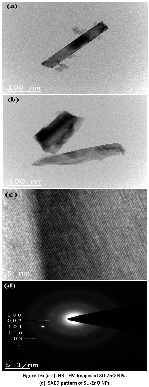 Figure 16: (a-c). HR-TEM images of SU-ZnO NPs. (d). SAED pattern of SU-ZnO NPs. |