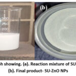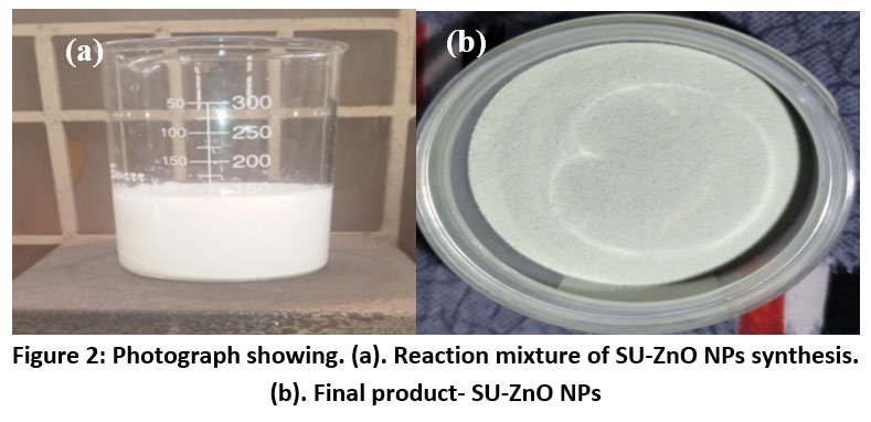 Figure 2: Photograph showing. (a). Reaction mixture of SU-ZnO NPs synthesis. (b). Final product- SU-ZnO NPs. |