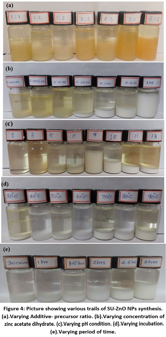Optimization is an action of developing a methodology that evolves a material with most effective properties and function. In nanotechnology, most important factors that govern the formation of good nanoparticles are the size, shape, yield, stability and method8. Parameters like concentration of precursor, ratio of additive and precursor, pH condition, temperature and time of the reaction were optimized and the most suitable condition for developing maximal yield were chosen using Ultraviolet-Visible (UV-Vis) spectrophotometer9. The concentration ratio of additive (SU extract): precursor (Zn (CH3COO)2. 2H2O) was optimized by trials with varying ratios (1:1, 1:2, 1:3, 2:1, 3:1, 2:3 and 3:2) in 0.01M Zn (CH3COO)2.2H2O. Similarly, the concentration of the zinc precursor was optimized by trials with varying concentration (0.001 M, 0.005 M, 0.01 M, 0.05 M, 0.1 M, 0.5 M and 1 M).The pH was maintained from 1 to 13, stabilized using 0.25 N HCl and 0.25 N NaOH. The reaction time was increased from 15 mins to 3.5 hrs and the optimal duration was fixed. Finally, the incubation temperature from 40℃ to 100℃ was monitored for evolving high yield nanoparticles. All the trials were labeled and their corresponding absorbance was recorded using UV-Vis spectrophotometer within the range 200 -800 nm.