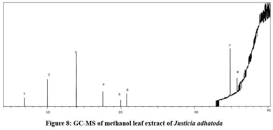 Figure 8: GC-MS of methanol leaf extract of Justicia adhatoda.Click here to View Figure