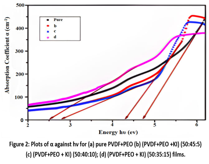 The negatively charged particle shift from the peak of the outer electron band to the trough of the free electron band is predominantly accountable for the UV absorption. As shown in Fig. 1, the Ultraviolet-visible absorption readings of the PVDF/PEO mixer and PVDF/PEO/KI solid polymer electrolyte films were documented at environmental temperature in the wavelength range of 250 to 950 nm. The carbonyl group in the pure polymer blend is responsible for the shoulder-like peak observed in the spectrum of the pure PVDF/PEO film at approximately 238 nm, as shown in the figure. In the doped films, the absorption coefficient increases with higher doping levels, and the shoulder shifts toward longer wavelengths. This behaviour may be attributed to the intense communication between PVDF/PEO and KI salt, as well as an increase in carbonyl groups [12].