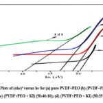 Here, d represents the sample’s thickness, and A denotes the absorbance. The absorption edge is located at 3.87 eV for pure PVDF/PEO films and decreases from 3.70 eV to 3.44 eV for the doped films.