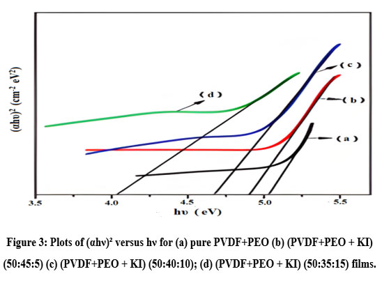 Figure 3: Plots of (αhν)² versus hν for (a) pure PVDF+PEO (b) (PVDF+PEO + KI) (50:45:5) (c) (PVDF+PEO + KI) (50:40:10); (d) (PVDF+PEO + KI) (50:35:15) films.Click here to View Figure |