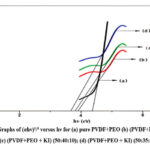 Figure 2: Plots of α against hν for (a) pure PVDF+PEO (b) (PVDF+PEO +KI)(50:45:5) (c) (PVDF+PEO + KI) (50:40:10); (d) (PVDF+PEO + KI) (50:35:15) films.Click here to View Figure |