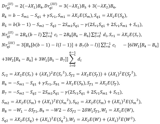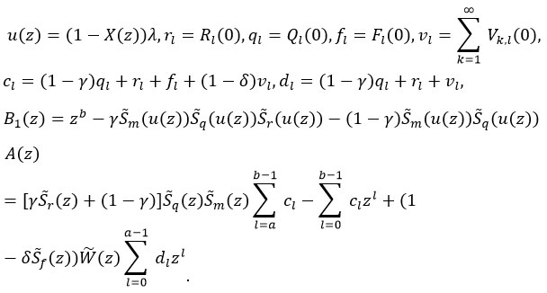 The probability-generating function (PGF) must satisfy the condition . This requirement is met by setting a term equal to 1 and applying L’Hopital’s rule in . Consequently, the steady-state condition for the model’s existence is given by ρ = λX1 (E(Sm)+E(Sq)+γE(Sr))/b < 1.