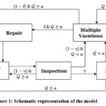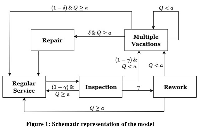 All operational times, such as normal service, inspection, rework, vacation, repair, etc., are also assumed to be of general (arbitrary) distributions, rendering the model relevant to real systems where there is bulk processing with concern for reliability and control of quality. The schematic representation of the model shown in Figure 1.