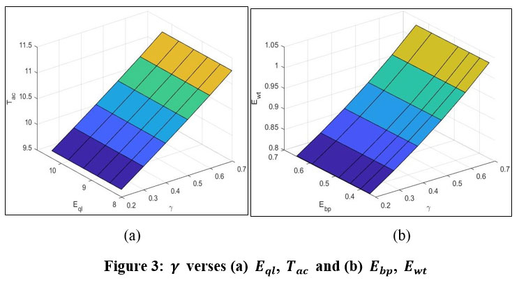 Figure 3(a-b) represents the impact of the probability of failure (γ) on the total average cost (Tac), expected queue duration (Eql), expected busy period (Ebp), and expected waiting time (Ewt) in a pharmaceutical manufacturing environment under a bulk queueing system. In this model, once a batch is through primary processing, it is inspected. If it is found to be faulty (γ), it is taken for the rework process immediately and then transferred to the package.