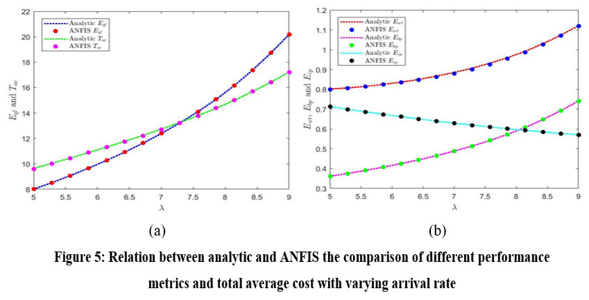 Figure 5: Relation between analytic and ANFIS the comparison of different performance metrics and total average cost with varying arrival rate