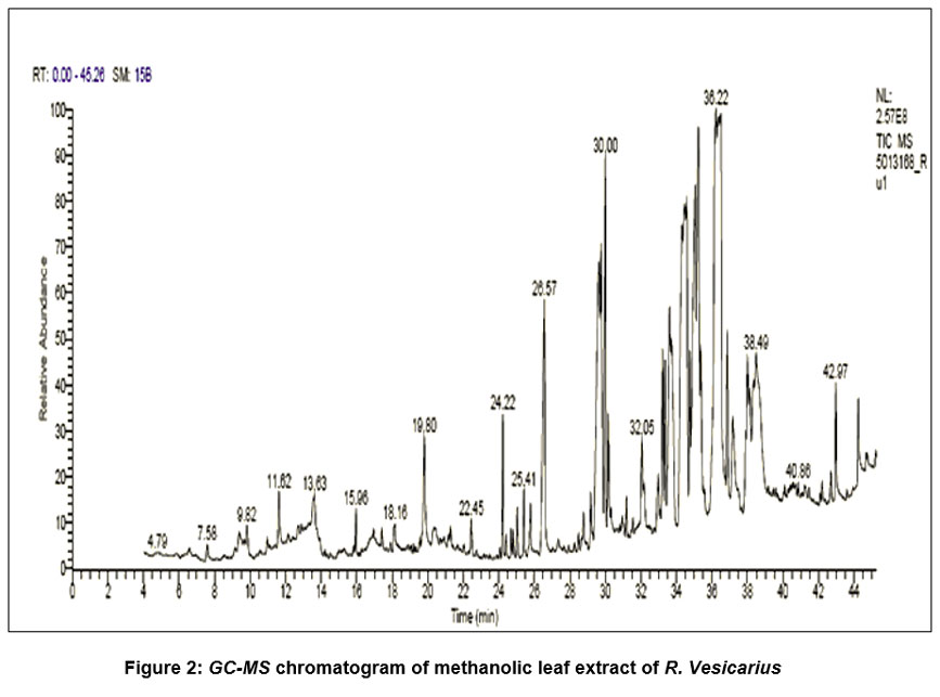 Figure 2: GC-MS chromatogram of methanolic leaf extract of R. VesicariusClick here to View Figure |