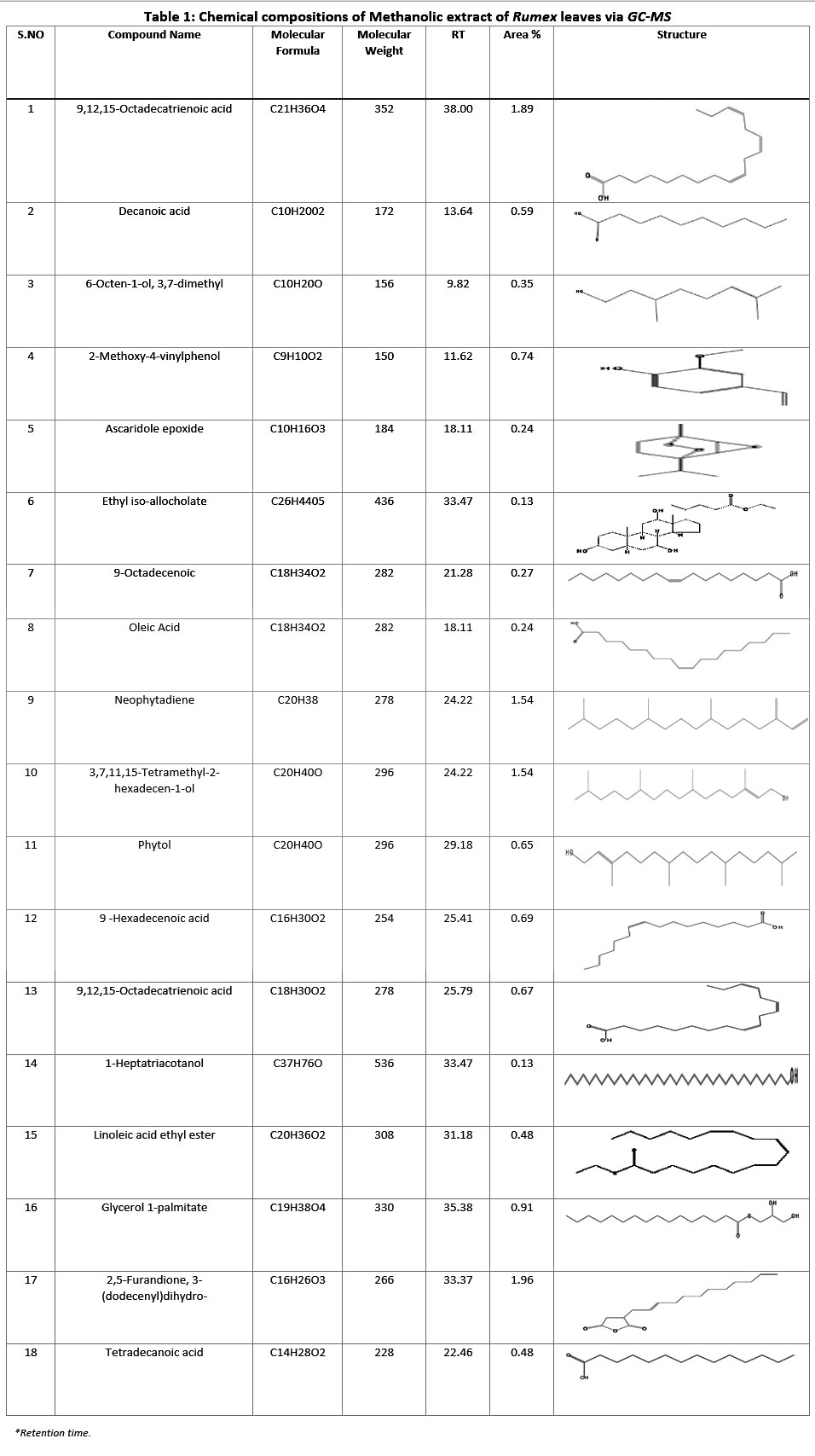 Table 1: Chemical compositions of Methanolic extract of Rumex leaves via GC-MSClick here to View Table |