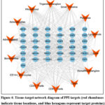 Figure 4: Tissue-target network diagram of PPI targets (red rhombuses indicate tissue locations, and blue hexagons represent target proteins). |