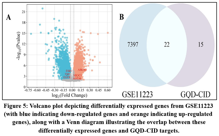 We obtained a gene dataset related to CID from the GEO database and conducted differential expression analysis using the GEO2R analysis tool, drawing a volcano plot of gene differential expression. In the volcano plot, the differential expression of the top-ranked genes in the PPI was displayed, among which TNF, EGFR, and ESR1 were all significantly downregulated. Furthermore, through the identification of differentially expressed genes using a significance threshold of p < 0.01 and intersecting them with the genes from the PPI network, a final set of 22 overlapping genes was obtained. These shared genes are likely to be critically involved in the initiation and progression of CID, offering valuable insights for uncovering its underlying molecular mechanisms.