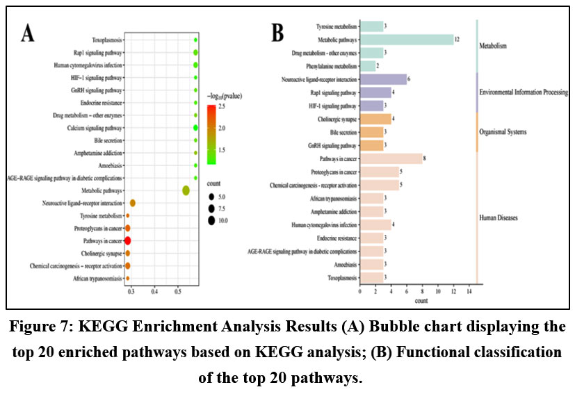 Figure 7: KEGG Enrichment Analysis Results (A) Bubble chart displaying the top 20 enriched pathways based on KEGG analysis; (B) Functional classification of the top 20 pathways. |