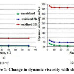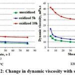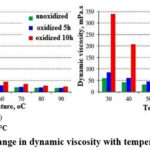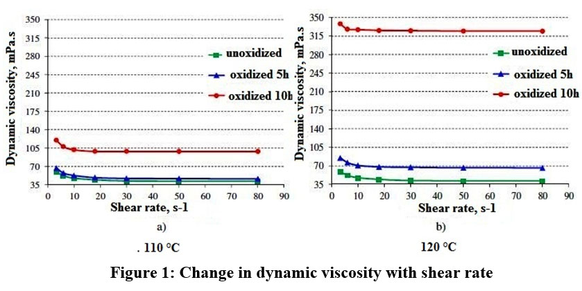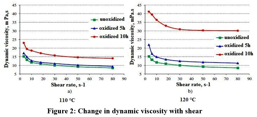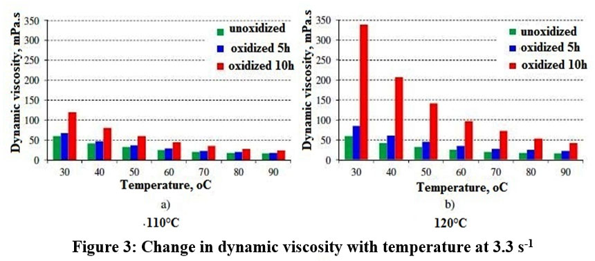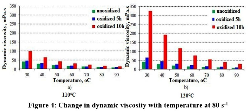 At both oxidation temperatures, dynamic viscosity increased significantly. However, as the temperature rose, the difference between oxidized and unoxidized samples decreased.