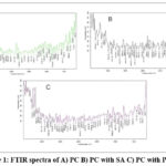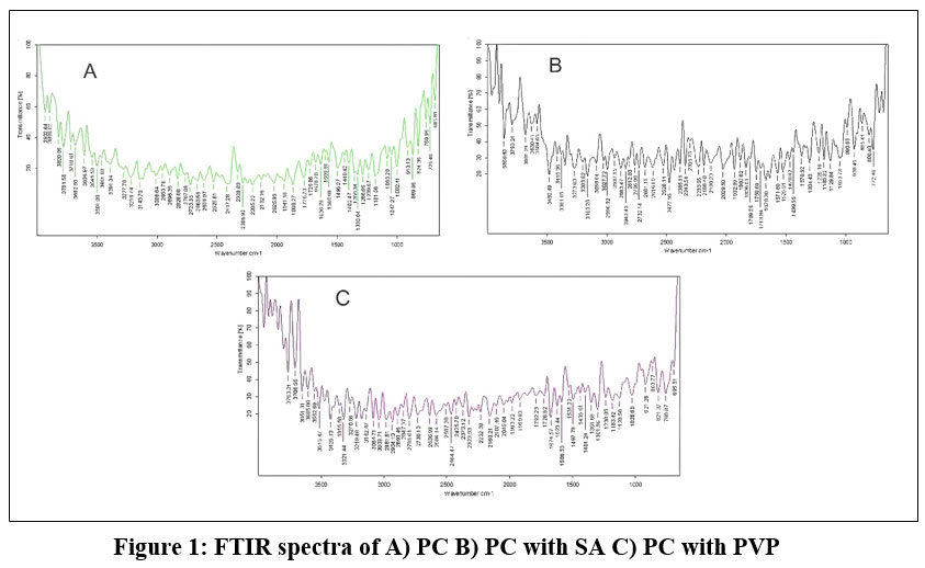 Figure 1: FTIR spectra of A) PC B) PC with SA C) PC with PVP |
