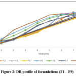The effect of polymer on the in vitro DR was influenced to a great extent. polymer concentration was varied for all 9 formulations. According to the multiple linear regression analysis, a decrease in X1 (sodium alginate) and X2 (PVP K30) causes the percentage of medication release to rise. The contour plot/design space and prediction establishment of this quadratic model are both supported by the model’s 0.8969 R2 value. The results were displayed in Table 10. Because of their hydrophilic character and quick hydration, the low concentration polymer sodium alginate and PVP K30 in the polymeric system result in controlled release drug delivery. Figure 2 depicts the in vitro release of PC from several films. From formulations F1 to F9, the DR was maintained linearly with an increase in sodium alginate and PVP K30 content. The DR values for each formulation ranged from 90% to 99.2%. 93%, 98%, 99.2%, 90%, 98%, 94%, 95%, 94%, and 98.5% are displayed in Formulations F1, F2, F3, F4, F5, F6, F7, F8, and F9. For formulation F3, the highest DR was discovered to be 99.2% during an 8-hour period. The data suggest that films with lower polymer concentrations released the medication more because they contained more carboxylic acid and had a higher number of free chains that might attach to the buccal mucosa. When the concentration of PVP K30 and sodium alginate was increased, the rate of DR significantly decreased23. The medication was delivered by formulations F1 and F2 for a maximum of six hr. The regulated release of the medicine is ensured by formulas F3, F5, and F6, which release the drug for up to seven hr. Variations in the polymer concentration led to variations in the time period’s release. Additionally, it was noted that the PVP K30 and sodium alginate fraction had an impact on the DR quantity at the maximum time points of 7 and 8 hr, respectively