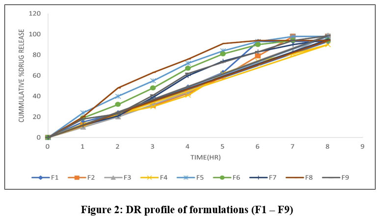 SI was performed for all the formulations. Studies of the swelling index were conducted for each formulation (F1 through F9). It was discovered that the swelling index for every movie fell between 126% and 405%. Table 6 displays the swelling behaviour of chosen films as a function of time. F1 formulation has shown only 163% at 8hr. SI was increased with an increase in the polymer concentrations21. The swelling indices of the films were increased up to 405% for formulation F9 at 8 hr and followed by F3, F4 and F7. higher swelling index may be owing to the existence of water-soluble polymers namely SA and PVP k30.