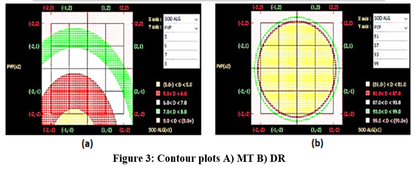 Figure 3 illustrates how contour plots were used to identify an appropriate design space for MT and DR within the inferred values. Through a multimodal mix of MT and DR, the study developed a design space that led to an acceptable operational series for articulating BFs. The response to the formulation was constructed and tested using the projected values. Contour plots made it probable to generate a variety of designs. For the optimal formulation, SA was adjusted to 2.5%w/v and PVP K30 to 3.25%w/v, while keeping all other constituents same. Using the prophesied and investigational values, the RE for each outcome was figured. The results are displayed in Table 11 and are 0.25% and 0.31%, respectively. The examined data supported the predicted values, demonstrating the validity and expectedness of the model.
