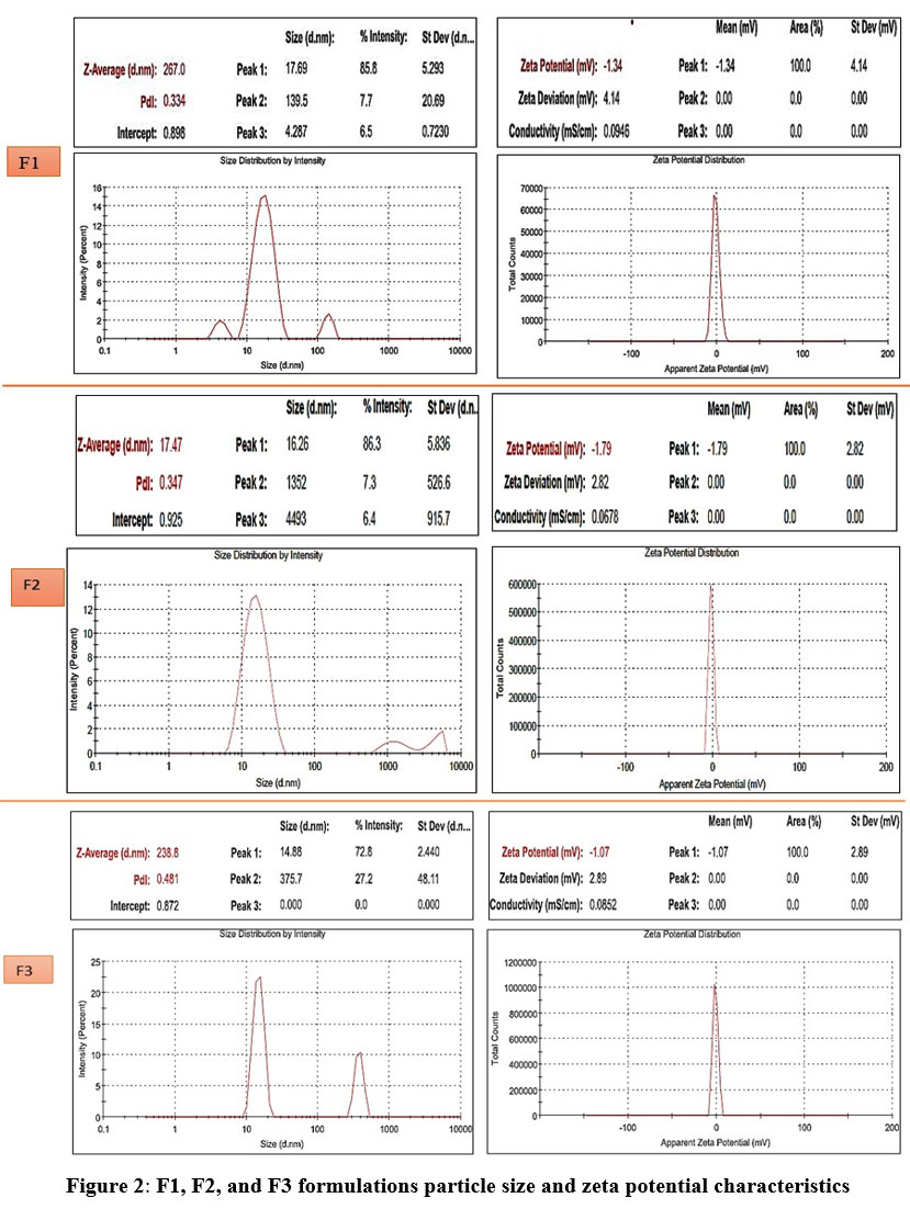 Figure 2: F1, F2, and F3 formulations particle size and zeta potential characteristics. |