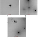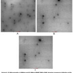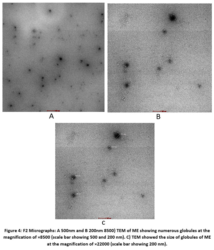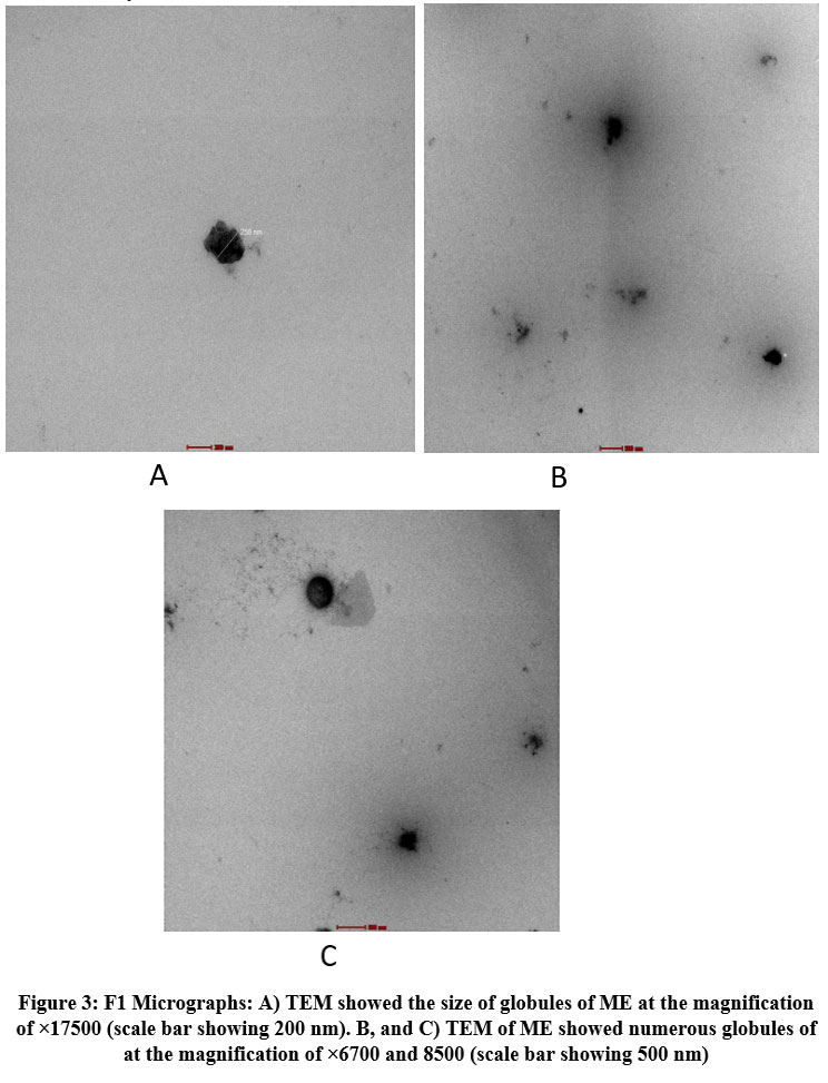 Figure 3 F1 Micrographs: A) TEM showed the size of globules of ME at the magnification of ×17500 (scale bar showing 200 nm). |