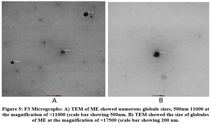 Figure 5: F3 Micrographs: A) TEM of ME showed numerous globule sizes, 500nm 11000 at the magnification of ×11000 (scale bar showing 500nm. |