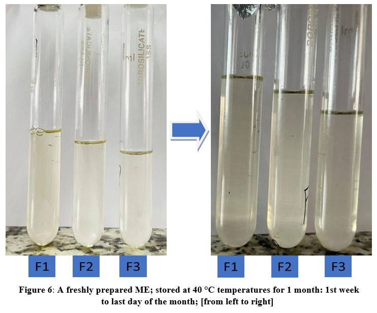 It was found that all ME formulations (F1, F2, F3) showed thermodynamic stability, without any phase separation, creaming, or cracking. ME demonstrated no breakdown, phase separation, or drug precipitation, which signifies thermodynamic stability against centrifugation and freeze-thaw cycles.