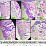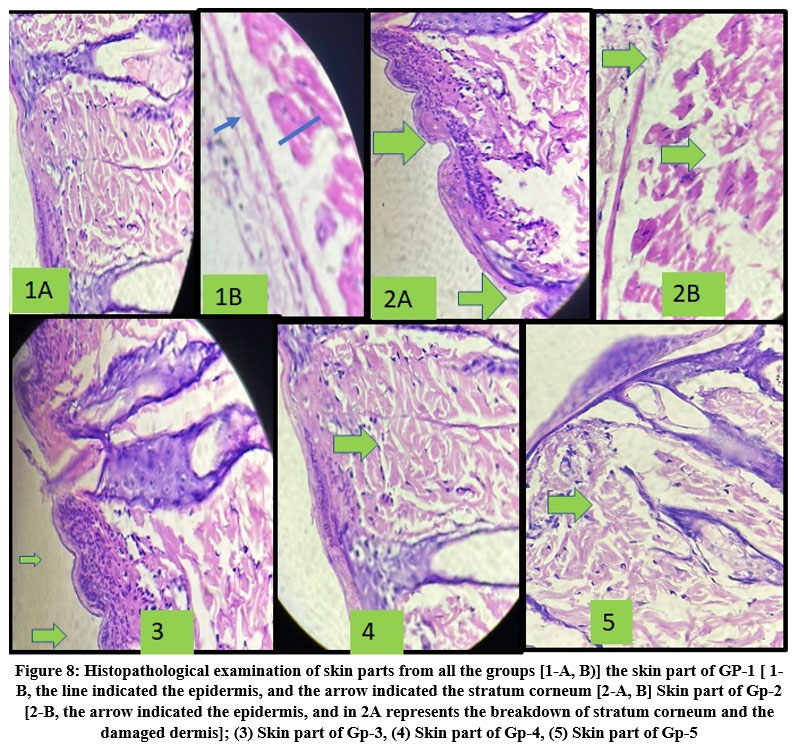 Figure 8: Histopathological examination of skin parts from all the groups [1-A, B)] the skin part of GP-1 [ 1-B, the line indicated the epidermis, and the arrow indicated the stratum corneum |