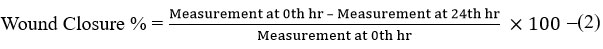 The wound healing assay is a commonly used in vitro assay for two-dimensional collective cell migration using VERO cell lines. The wound healing assay consists of applying controlled “wound” to a confluent monolayer of cells to assess how much they migrate into the wound. Cell migration is an important process for tissue repair and regeneration, as well as for cancer metastasis and development. VERO cells were seeded in six-well plates and allowed 24 hours for formation of a monolayer. After confirming the confluence of the cells in the well, a scratch was performed in the well with a sterile pipette tip, while treating the wells with a 100 µg/mL concentration of the sample or positive controls. All plates were then incubated further for 12 hours where cell migration into the wound was viewed using microscopy (Figure 3). The wound closure of 72% indicated that cell migration had occurred and demonstrated the properties of the material to induce wound healing. (Figure 9).