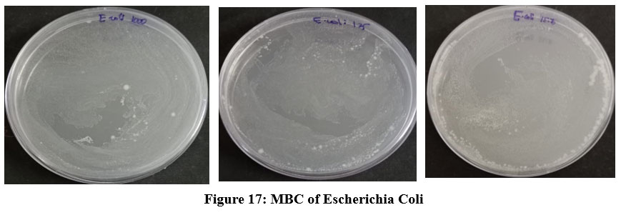 To determine the MBC, the Sample were drawn from(1000µg/ml,125µg/ml,15.6µg/ml) Tubes and plated enumerate the viable colonies by pour plate method. It was then incubated for 24 hours, the outcomes for this period were shown(Figure 17 to 20)(Table 4).