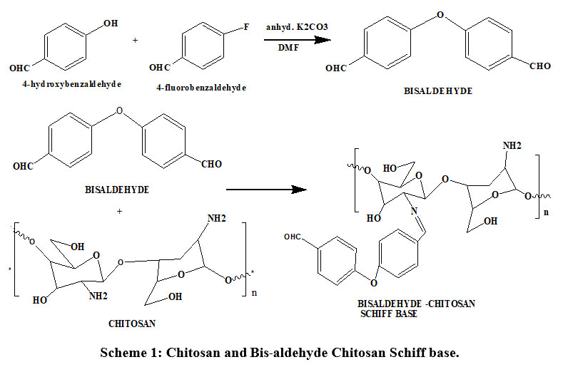 In a round bottom flak, 50 mL of 2 % was added slowly to 0.5 g of deacetylated chitosab with stirring. The above chitosan solution was agitated in a stirrer for three hours at 50 ◦C until a thick, yellow solution with a pH of 6.0 was formed.11,12 Then, 0.35 g of Bis-aldehyde dissolved in 15 mL of ethanol was added slowly , and the blend was disturbed continually with a reflux condenser for about 12 hours at 600C. White crystalline solids with a yield of 94% (0.72gm) are the end product of the reaction. The precipitate formed is filtered, washed with acetone, and then dried at 500C for six hours.