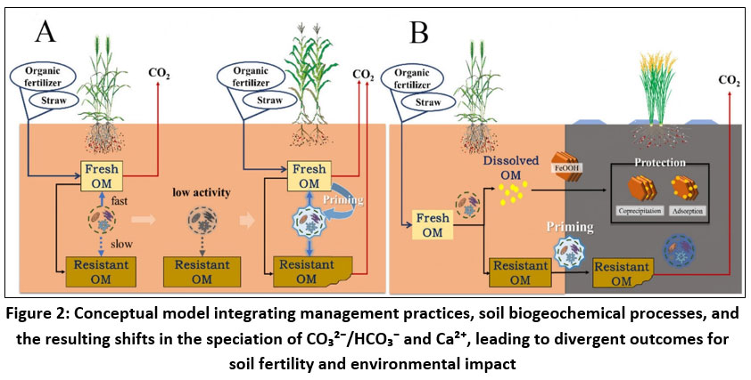 Figure 2: Conceptual model integrating management practices, soil biogeochemical processes, and the resulting shifts in the speciation of CO₃²⁻/HCO₃⁻ and Ca²⁺, leading to divergent outcomes for soil fertility and environmental impact |
