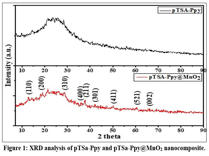 Figure 1: XRD analysis of pTSa-Ppy and pTSa-Ppy@MnO2 nanocomposite. Click here to View Figure |
