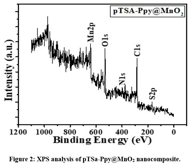 To further elucidate the surface elemental composition of pTSa-Ppy@MnO2 nanocomposite, XPS analysis was conducted. The survey spectra (Fig. 2) showed the presence of Mn2p and O1s peaks corresponding to the presence of MnO2 while the C1s and N1s corresponds to the Ppy polymer while S2p corresponds to its successful doping with pTSa.