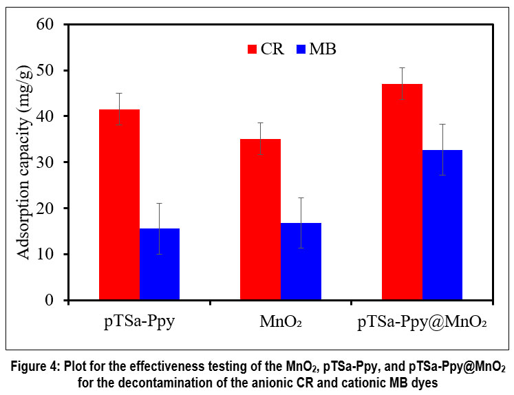 In summary, this work demonstrates that MnO2 insertion and doping with paratoulene sulfonic acid of Ppy improves the selective adsorption of cationic CR dye. The morphological analysis showed the features of both MnO2 nanorods and porous Ppy structures. The structural analysis by XRD and XPS showed that MnO2 is well interacted with Ppy and its successful doping with pTSa. The pTSa-Ppy and pTSa-Ppy@MnO2 showed selective adsorption of anionic CR in contrast to cationic MB dye which was poorly adsorbed. The highest R² of 0.928 and lowest RMSE of 3.445 suggested that adsorption was predominated by the physisorption as well as chemisorption forces. The antibacterial studies against E. Coli and B. cereus showed that the control was found to be least effective, with most bacterial growth, followed by pTSa-Ppy and pTSa-Ppy@MnO2. These results show that pTSa-PPy@MnO2 composites can be effective antimicrobial agents against Gram-positive and Gram-negative bacteria.