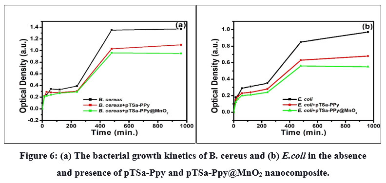 Figure 6: (a) The bacterial growth kinetics of B. cereus and (b) E.coli in the absence and presence of pTSa-Ppy and pTSa-Ppy@MnO2 nanocomposite. Click here to View Figure |