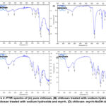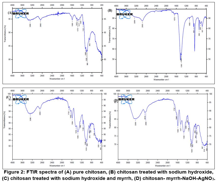 FTIR spectroscopy was applied to analyze the chemical structure of chitosan, myrrh and the synthesized chitosan–myrrh–silver hydrogel. FTIR spectra of pure chitosan (A), chitosan with sodium hydroxide (B), chitosan with sodium hydroxide and myrrh (C), and chitosan with sodium hydroxide, myrrh, and silver nitrate (D). The Perkin-Elmer 1710-FTIR spectrometer was used to get IR spectra at the University of Mosul.