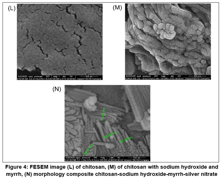 Figure 4: FESEM image (L) of chitosan, (M) of chitosan with sodium hydroxide and myrrh, (N) morphology composite chitosan-sodium hydroxide-myrrh-silver nitrate Click here to View Figure |